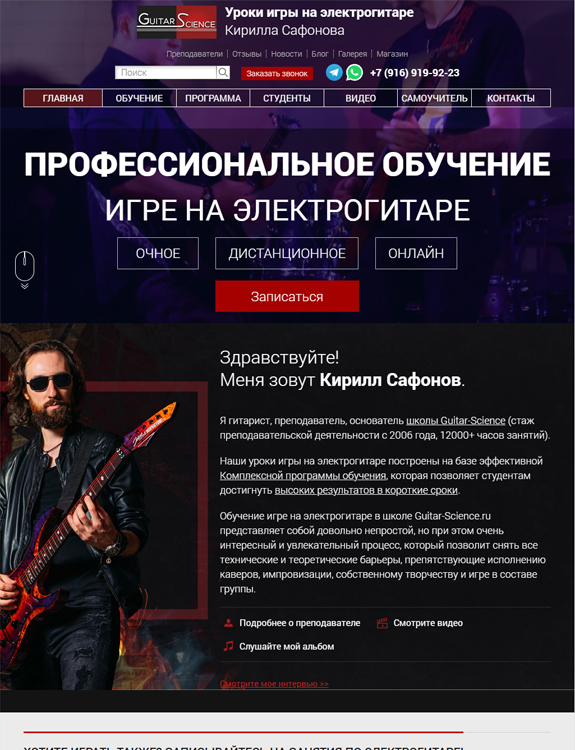 - Отзывы и рекомендации: Раздел с отзывами студентов, дополненными видеоматериалами, а также рекомендации известных гитаристов, что создает доверие к школе.