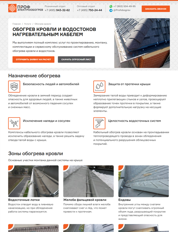 - Детальное описание услуг: Блоки «Зоны обогрева» и «Виды нагревательного кабеля» предоставляют подробные описания, помогая клиентам лучше понять предлагаемые услуги.