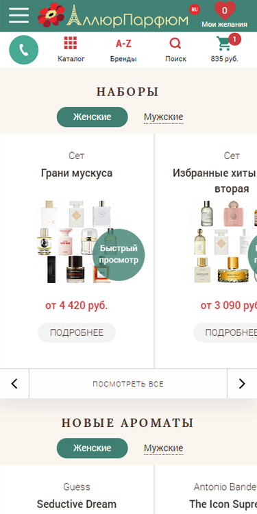 В 2015 году мы уже сотрудничали с «АллюрПарфюм», когда они обратились к нам с просьбой о верстке и интеграции их сайта на платформе 1С-Битрикс. После успешной реализации этого проекта заказчик вновь обратился к нам за модернизацией сайта, которая включала разработку нового логотипа, обновление дизайна, а также интеграцию с системами 1С, RetailCRM, платежными системами и службами доставки.